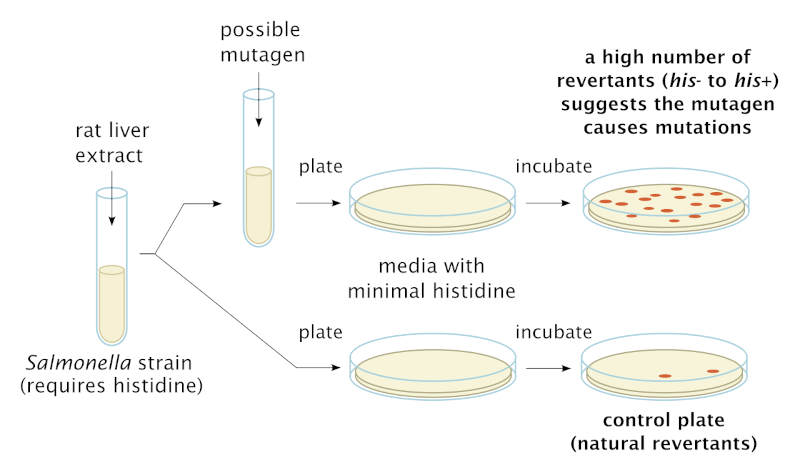 The Ames test was developed in the early 1970s by Bruce N. Ames (1928–2024) to detect whether chemicals cause genetic mutations in bacteria. It makes use of several mutant strains of Salmonella typhimurium that are deficient in synthesizing the essential amino acid histidine. These strains are normally unable to grow on minimal media, but the presence of a mutagenic chemical will induce mutations that restore a bacterial cell’s ability to make its own histidine. The original test examined growth of the Salmonella strains on a petri dish; each colony of cells represented a mutation. Next figure depicts the Ames test.