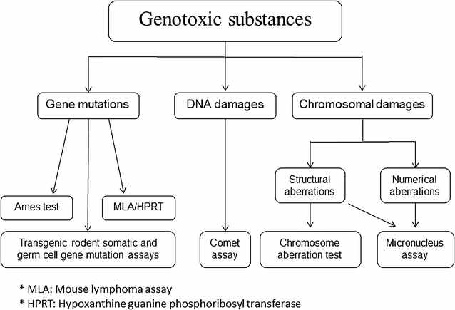 Diagrama esquemàtic que representa els mètodes d’assaig més comuns utilitzats per a detectar substàncies genotòxiques. El test d’Ames està sota la secció de mutacions genètiques a l’extrem esquerre. Journal of Translational Medicine.