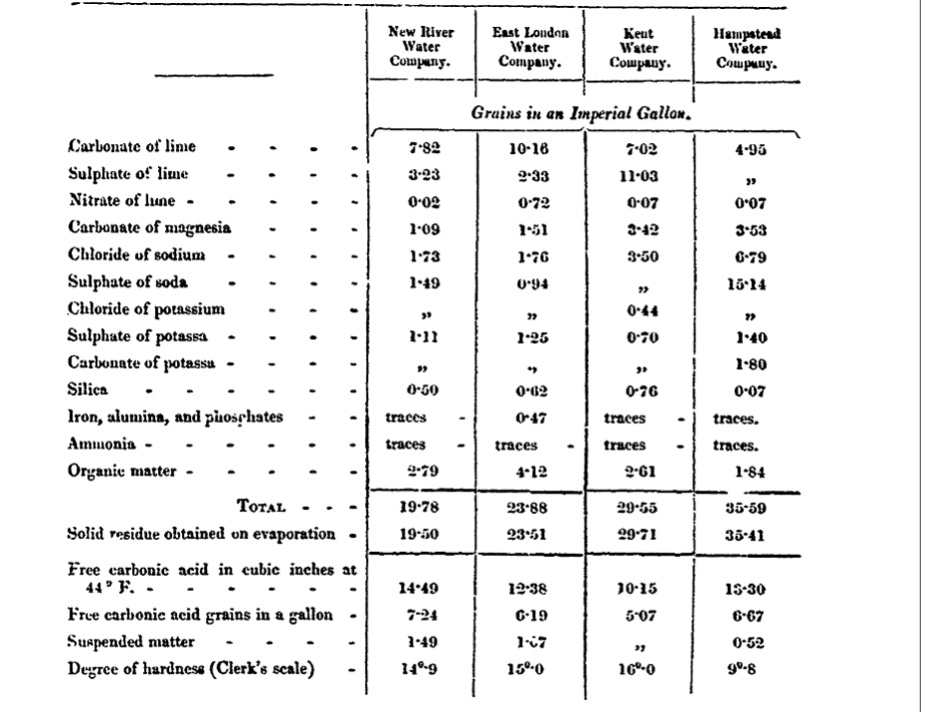 Una tabla de análisis de agua en Londres en los años anteriores a la bacteriología. Fuente: Report of the Government Commission on the Chemical Quality of Supply of Water to the Metropolis, 1851.