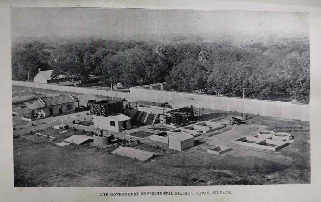 Una estación experimental de filtración de agua creada por el gobierno de Madrás durante la década de 1920. Fuente: Report on the Experiments Conducted at the Government Experiment Filtration Station at Kilpauk, 1929.