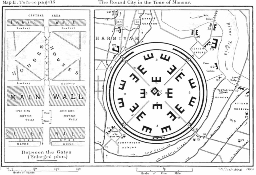 Reconstrucció de la planta circular de Bagdad feta per Guy Le Strange a Baghdad During the Abbasid Caliphate From Contemporary Arabic and Persian Sources, Oxford: Clarendon Press, 1900. Wikimedia.
